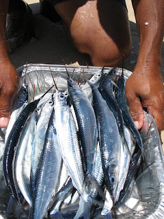 Earlier at the despedida for SM, Maun Toi also bought a big load of 'samber' fish which look like miniature swordfishes cos of the long whatmachacallit (spike? pointy thing?) but they did have a cute little red tip at the end. I only thought it was a pity that so many were females, packed with roe that the Timorese wolfed down delightfully. I wonder where the males were! not a single one i ate was a male fish. anyways, it was a nice saturday out - blue sky, blue sea, and lots of fish!