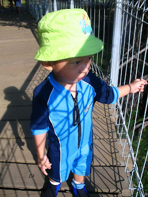 Now he's ready to tackle the surf! My very own surfer dude!The babe has really become a boy - i know i keep saying that! but really. these days he's developed a real penchant for toy cars after we dug out those old metal cars that my mom bought for me and my sis almost 30 years ago! he would lie on the bed and go "boooo" as he moves them up and down the bed, enraptured by his own boy world. He sat in a buggy on Sentosa and loved the ride. Now he signs the word "car" by showing the steering motion (he finally understood what i was doing all this while after seeing the buggy driver do it up close) and says "booo boo" for car. yesterday, he finally intoned "kar" with a sophisticated "r" at the back. He's beginning to speak more in Chinese too. Now he says "gou" for dog, and "shu" for tree.