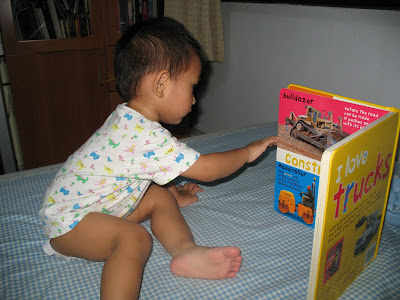 Val and one of his favourite books - of trucks- his obsession for things that go have begun!Now that Mr Smellybottom has found his 'tongue', he's begun to parrot most of what we say to our bemusement - most of the time. Often, he spouts words in Chinese because his grandparents are the main caregivers. it's quite apparent the influence of caregivers cos in the first year when i was with him, most of the words he picked up was in English, now the new words are invariably in Chinese.